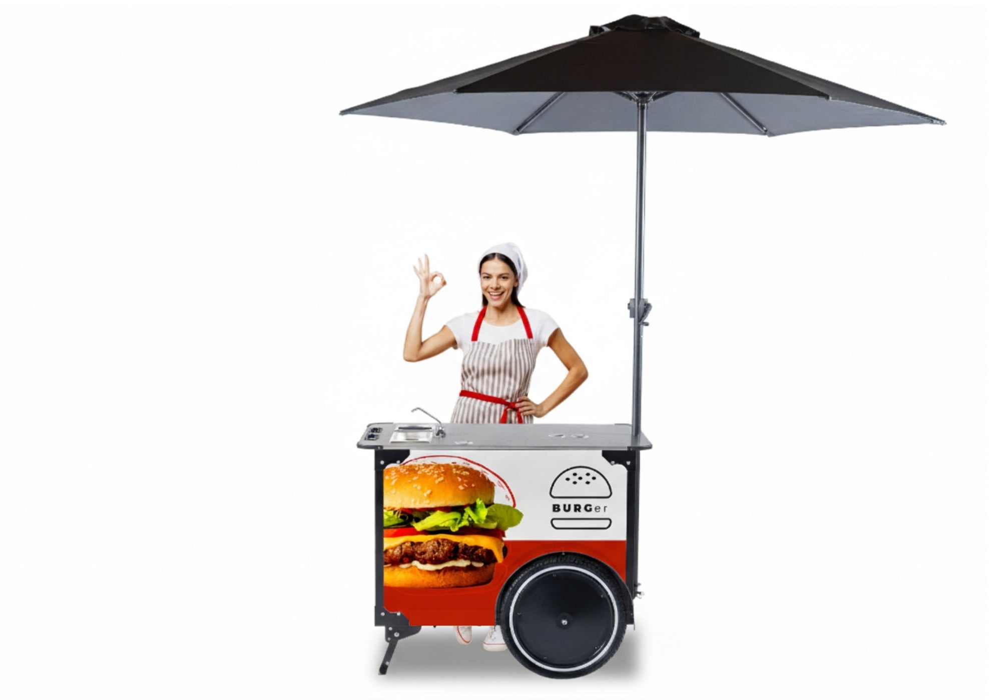 Construit sur un châssis solide mais compact, le Street Food Cart M est conçu pour un usage professionnel quotidien et peut être entièrement personnalisé avec votre logo, vos couleurs et vos graphismes, en faisant un puissant outil marketing et commercial pour votre concept de street food.