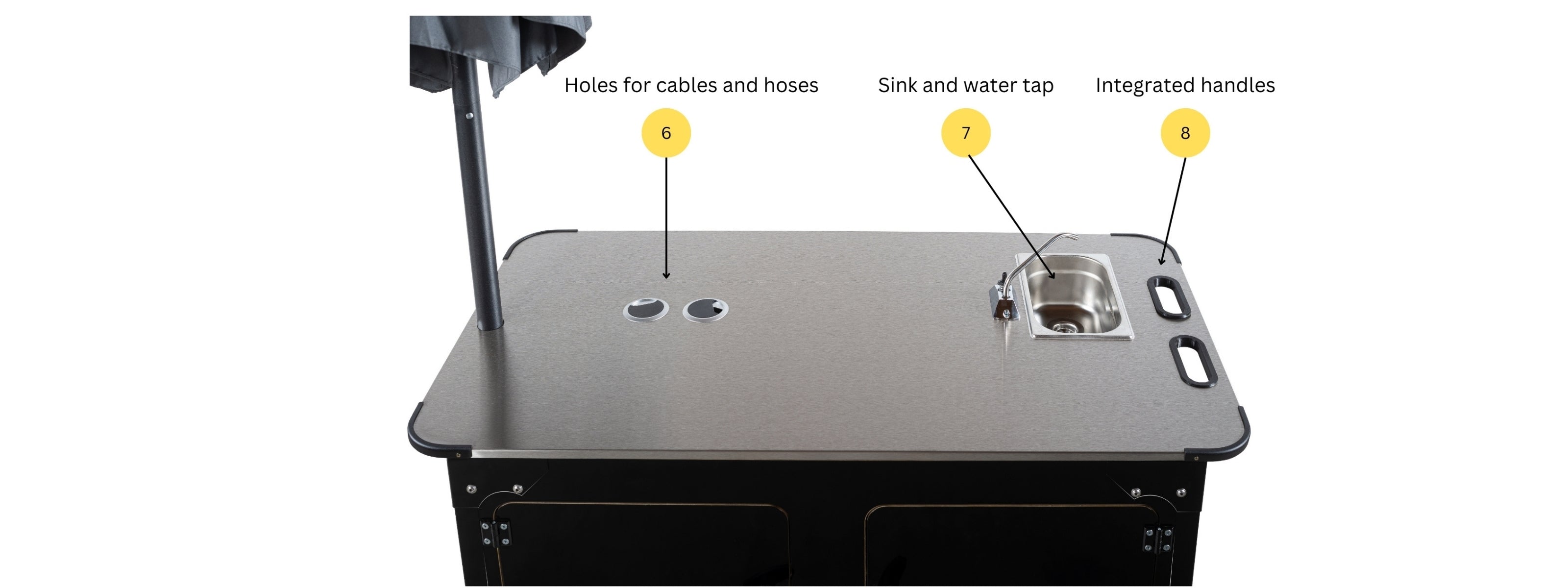 Equipments: -Electrical system with 3 sockets and 3 meter cable to connect to the grid;-GN ¼ water sink with tap/water pump/ 10 liter fresh water tank+10 liter waste water tank.