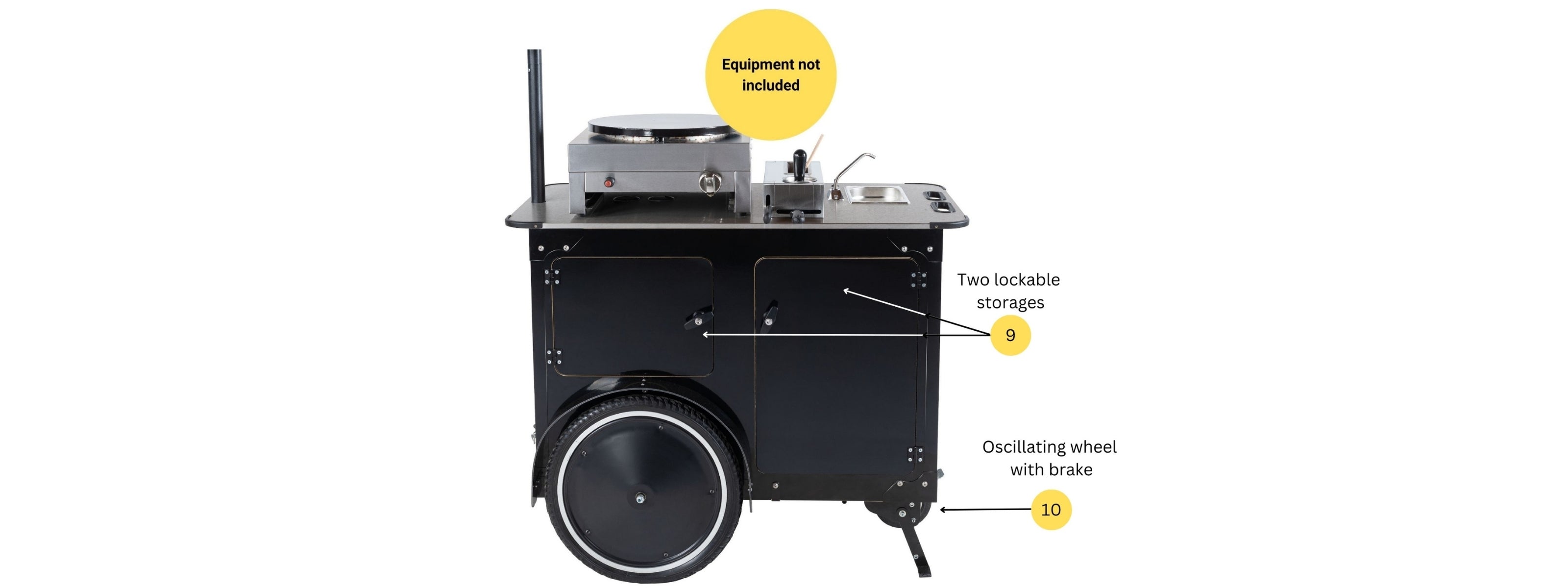 Street Food Cart M is a compact vending cart designed to be towed by a bicycle using a towing arm and saddle-mounted coupling. It’s light, agile, and easy to attach, making it ideal for quick setups and mobile sales in busy urban areas. Braking is handled entirely by the bicycle’s own brake system; the cart itself has no integrated brakes.